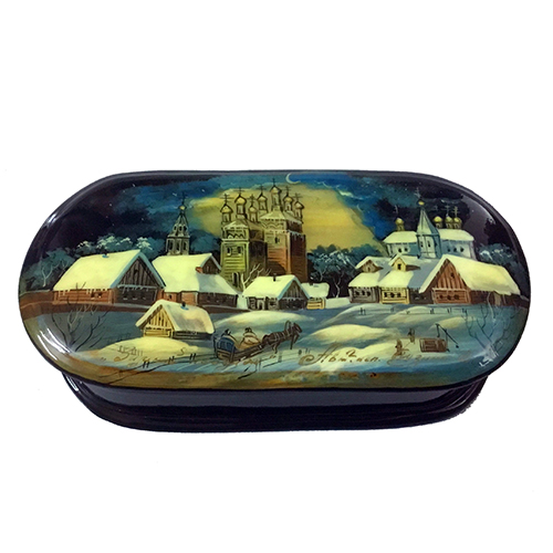 Лаковая миниатюра Шкатулка "Зимний пейзаж". Ручная роспись.