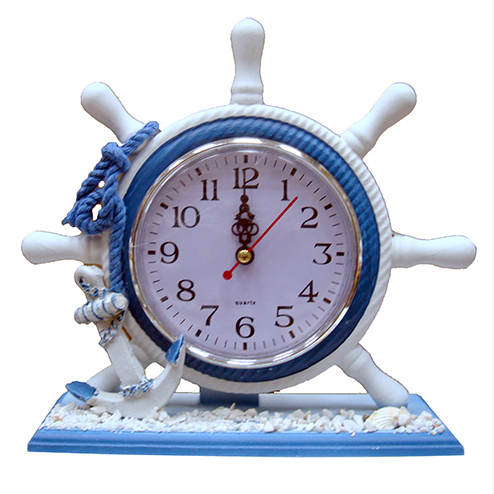 Часы настольные кварцевые в виде штурвала с декоративными элементами из полистоуна на морскую тему.