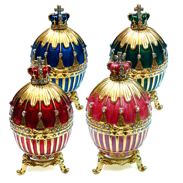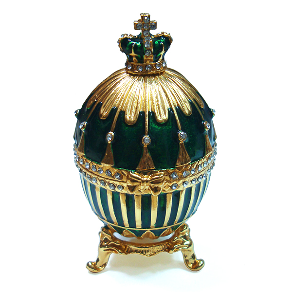 Роскошная шкатулка – яйцо в стиле Фаберже изготовлено из металла, покрыто холодной эмалью и инкрустировано стразами.