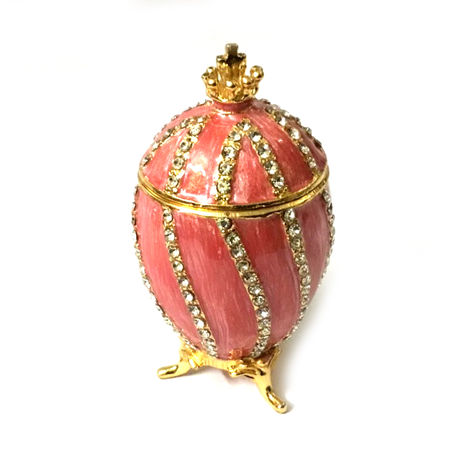 Роскошная шкатулка – яйцо в стиле Фаберже изготовлено из металла, покрыто холодной эмалью и инкрустировано стразами.