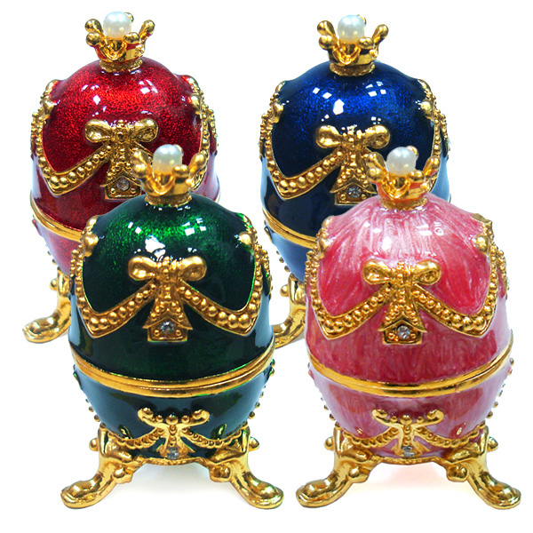 Роскошная шкатулка – яйцо в стиле Фаберже изготовлено из латуни, покрыто холодной эмалью и инкрустировано стразами.