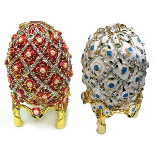 Роскошная шкатулка – яйцо в стиле Фаберже изготовлено из металла, покрыто холодной эмалью и инкрустировано стразами.