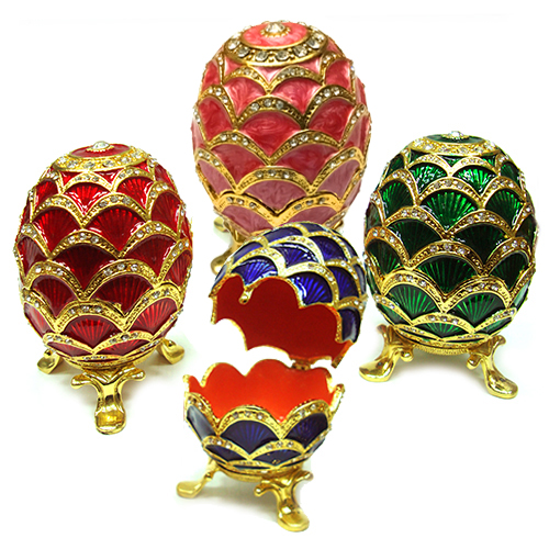 Роскошная шкатулка – яйцо в стиле Фаберже изготовлено из металла, покрыто холодной эмалью и инкрустировано стразами.