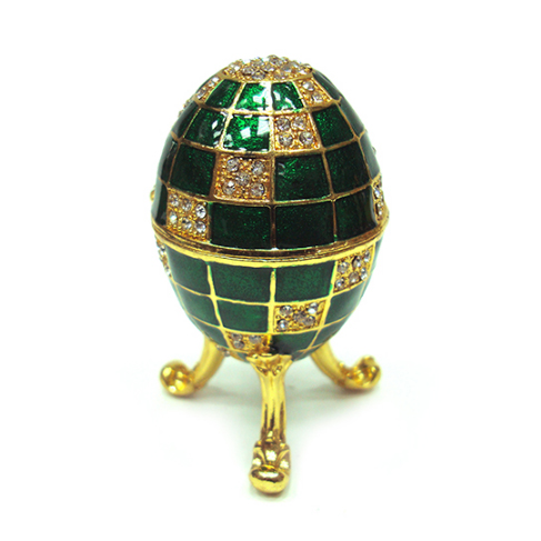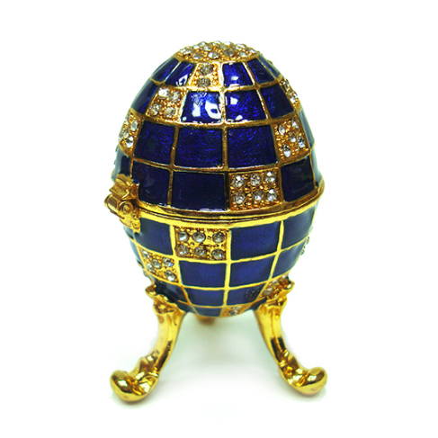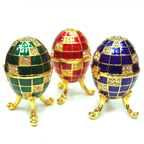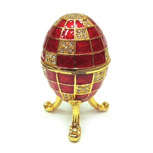 Роскошная шкатулка – яйцо в стиле Фаберже изготовлено из металла, покрыто холодной эмалью и инкрустировано стразами.