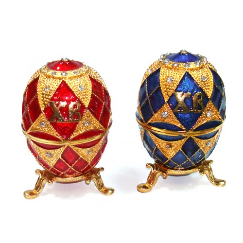 Роскошная шкатулка – яйцо в стиле Фаберже изготовлено из металла, покрыто холодной эмалью и инкрустировано стразами.
