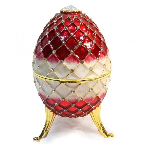 Роскошная шкатулка – яйцо в стиле Фаберже изготовлено из металла, покрыто холодной эмалью и инкрустировано стразами.