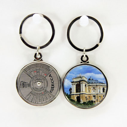 Брелок-календар металевий на 50 років з видом на оперний театр (Одеса) - обертаючи диск, поєднуємо шукані рік і місяць - на нижній шкалі отримуємо актуальний календар. Просто і зручно. Враховуючи, що календар повторюється кожні 12 років, цей брелок календар - навічно. Може стати оригінальним подарунком.