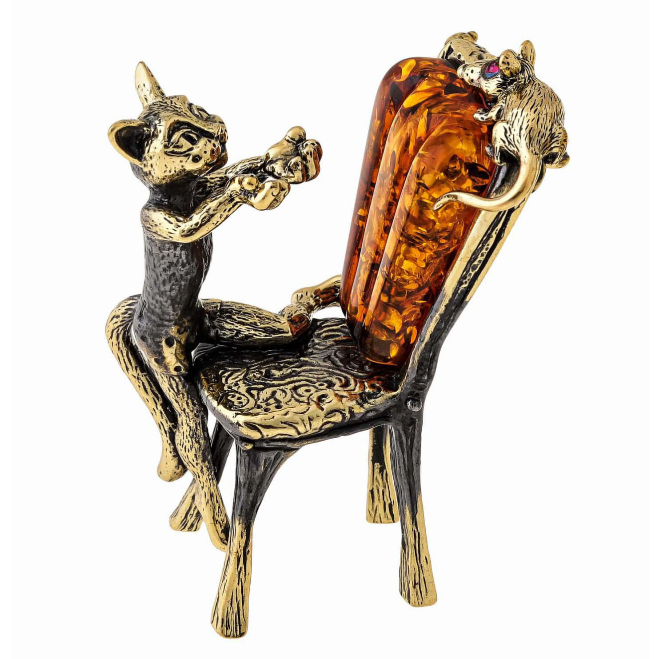 Фігурка з бронзи і бурштину 'Кіт на стільці ловить мишку'.