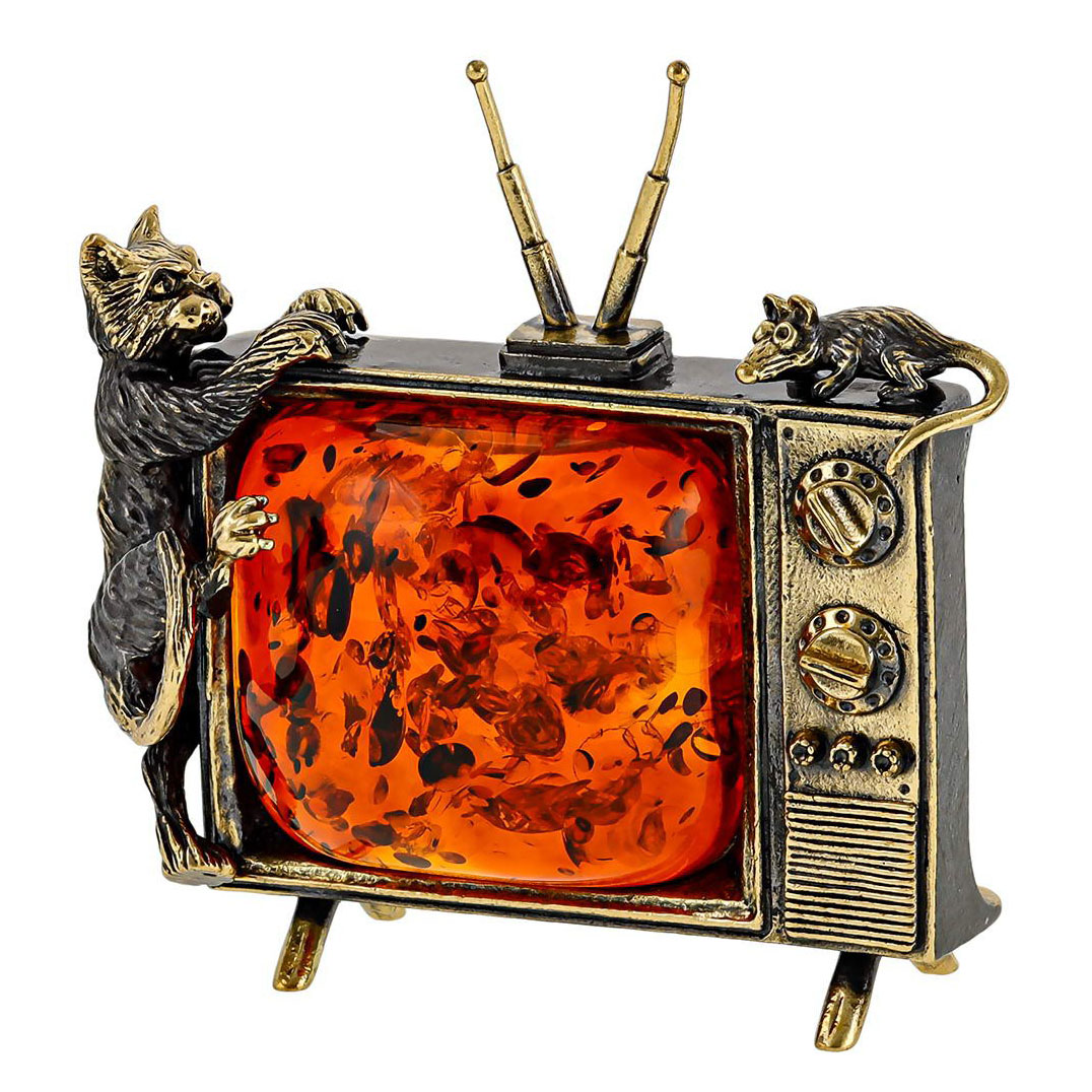 Фігурка з бронзи і бурштину Кіт на телевізорі ловить мишку №2546K