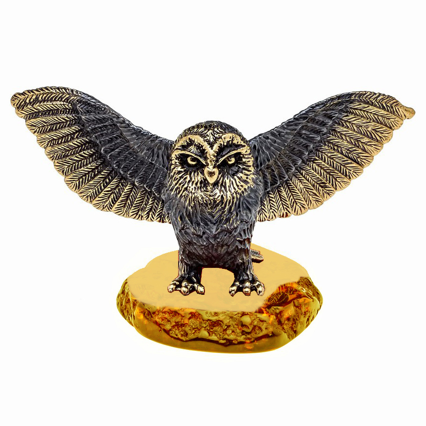 Фігурка з бронзи і бурштину Птах Сова Хедвіг №1122B