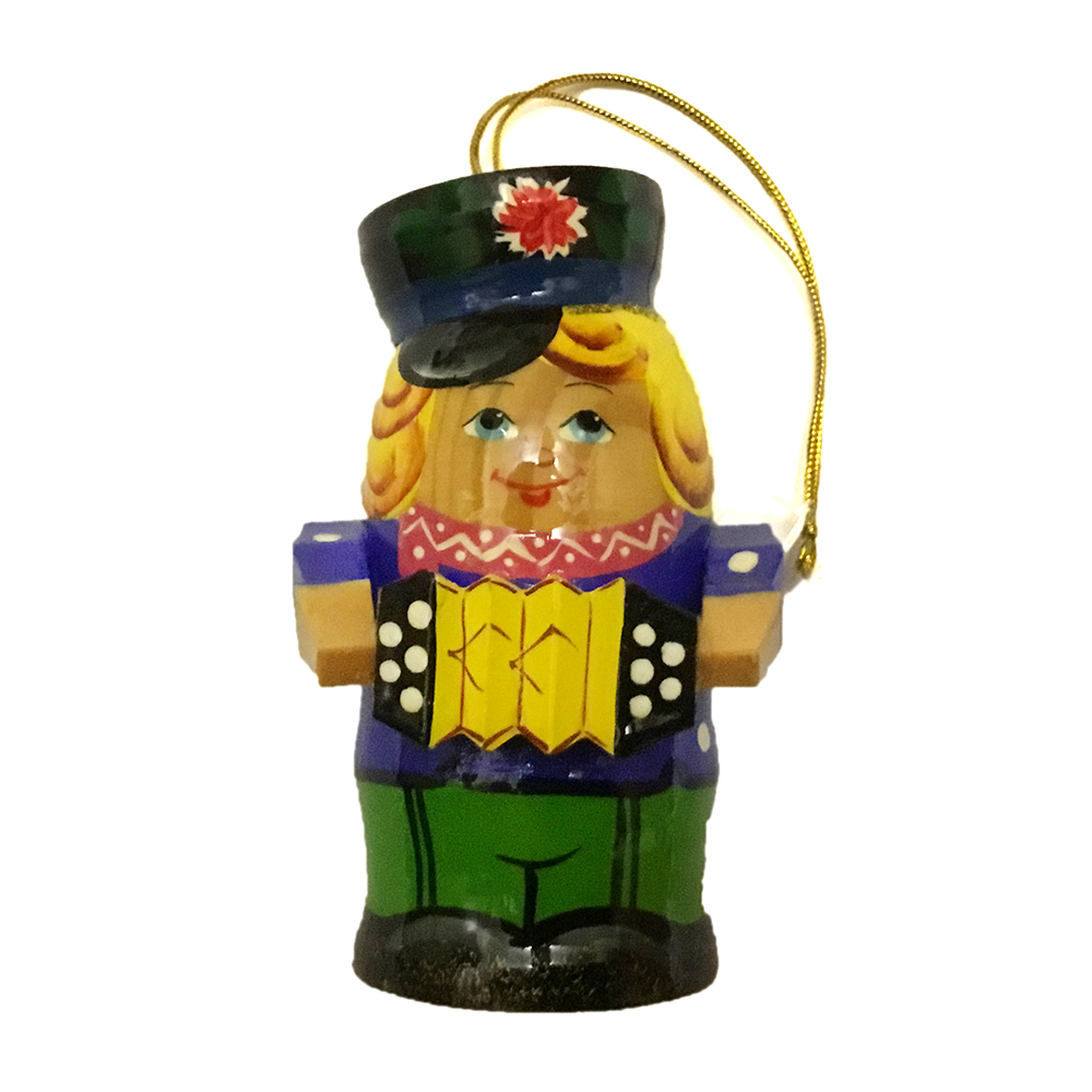 Новорічна іграшка для ялинки ручної роботи з дерева з художнім розписом 'Хлопчик-музикант'.
