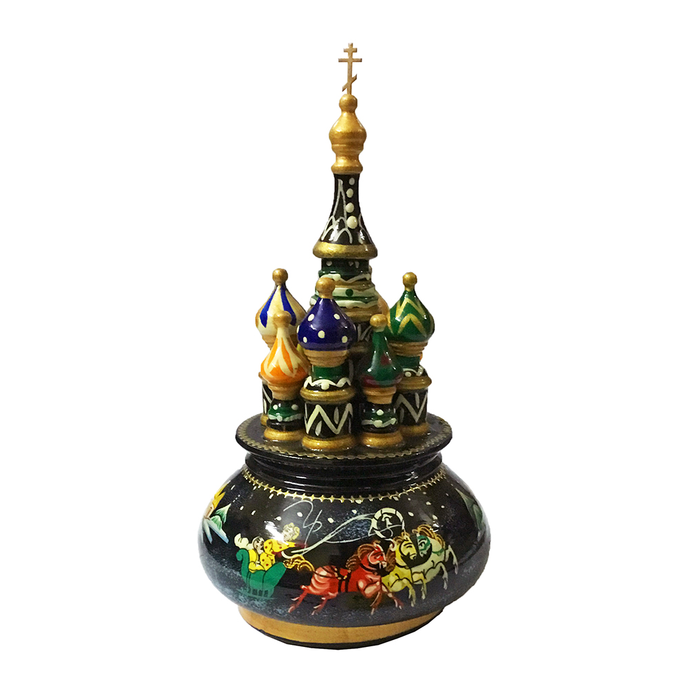 Церква музична з дерева, ручна робота, художній розпис. З вбудованим заводним музичним механізмом, завдяки якому обертається і звучить мелодія.