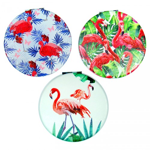 Дзеркало металеве з оздобленням зі штучної шкіри, двостороннє, кругле, на магніті з різними зображеннями Фламінго.