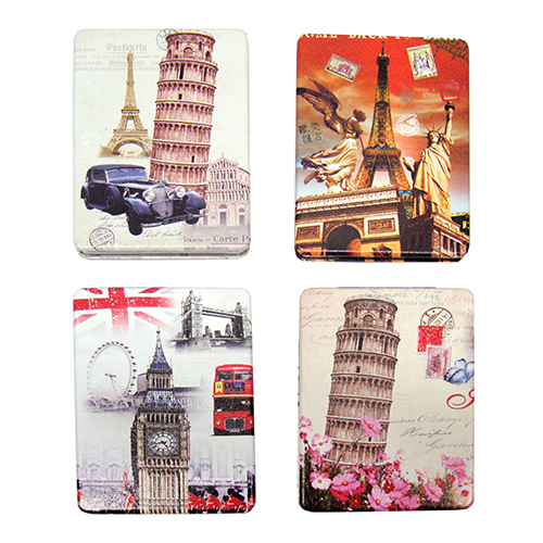 Дзеркало металеве з оздобленням зі штучної шкіри двостороннє прямокутне на магніті з різними зображеннями Європейських міст.