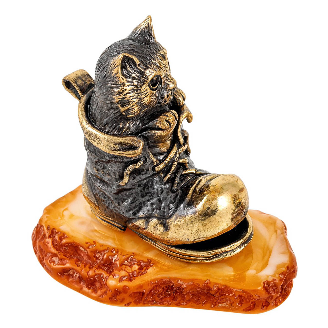 Фигурка из бронзы и янтаря "Котик в башмаке".