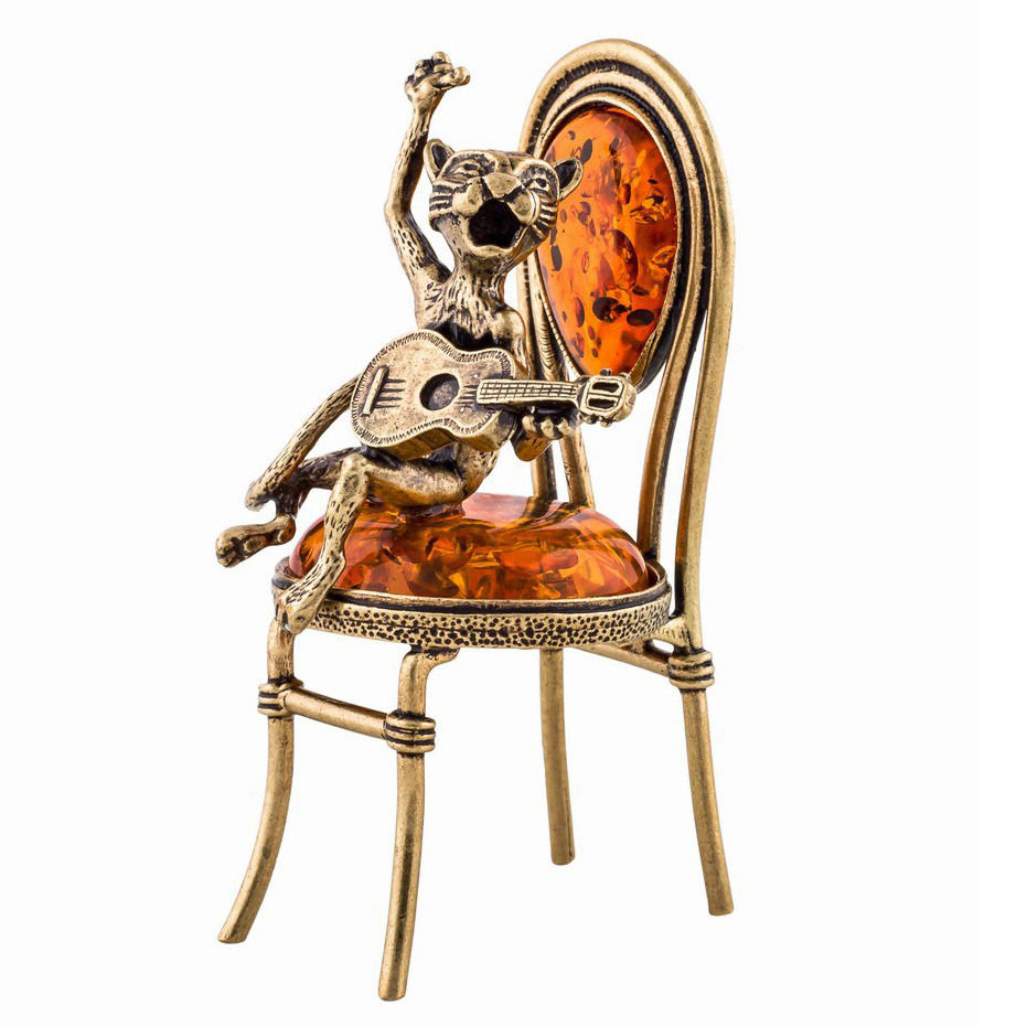 Фигурка из бронзы и янтаря Кот певец с гитарой на стуле №599K