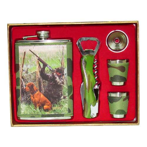 Набір з: фляга, 2 стоси, лейка, складний ніж зі штопором і відкривалкою.