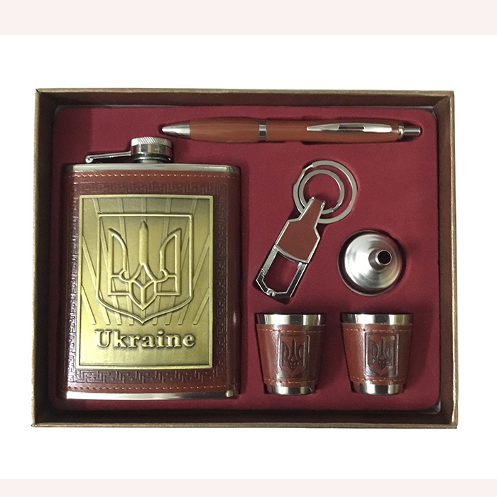 Фляга з металу в кож-заміннику в подарунковій коробці.