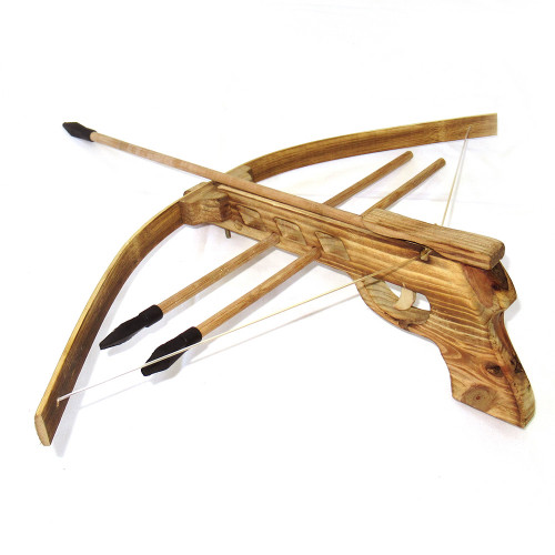 Іграшкова зброя арбалет, виготовлена з дерева. У комплекті три стріли з гумовими наконечниками.