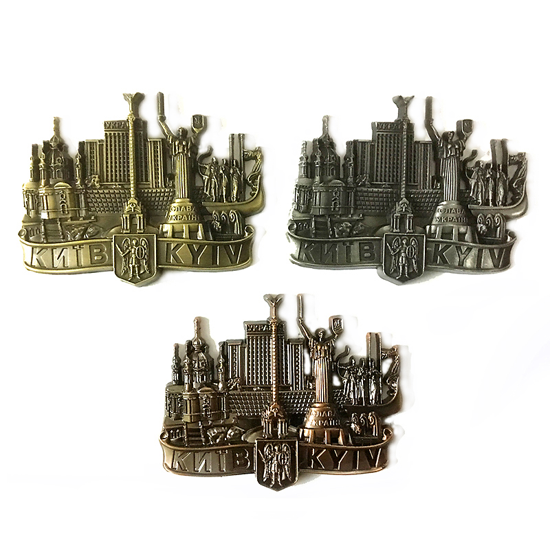 Магніт з металу з видами: Андріївська церква, Майдан Незалежності, Пам'ятник засновникам Києва, Михайлівський собор, статуя Батьківщина Мати.