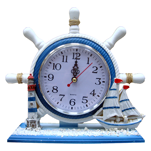 Годинник настільний кварцевий у вигляді штурвала з декоративними елементами з полістоуна на морську тему.