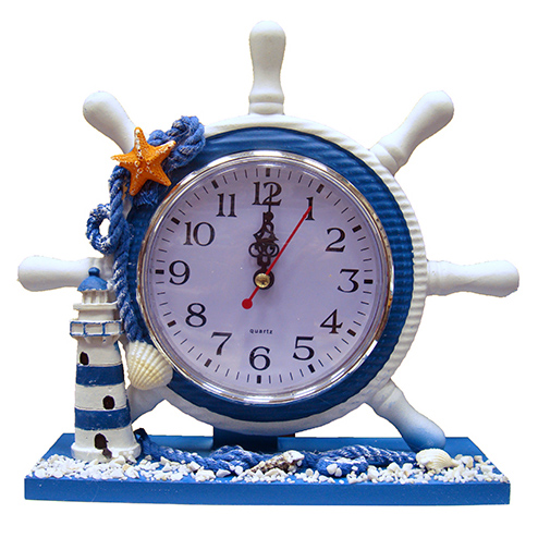 Годинник настільний кварцевий у вигляді штурвала з декоративними елементами з полістоуну на морську тему.