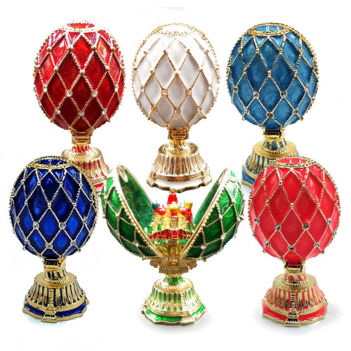 Яйце-шкатулка під Фаберже, всередині з храмом. Виготовлена з металу, покрита кольоровою емаллю і прикрашена стразами.