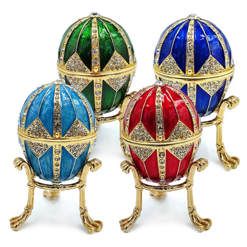 Яйце-шкатулка Фаберже, зроблено з металу, покрито кольоровою емаллю і прикрашено стразами.
