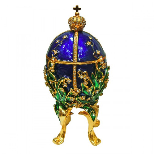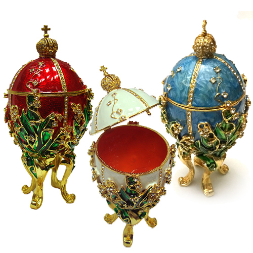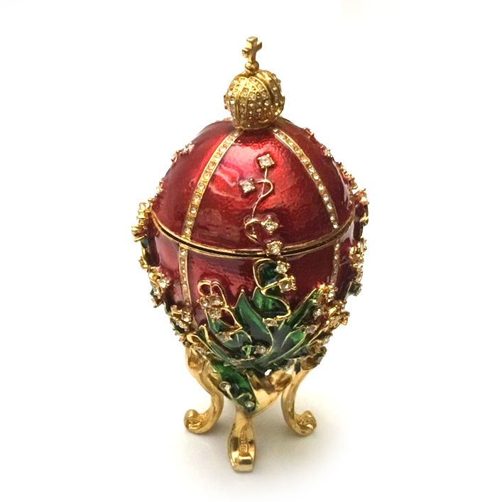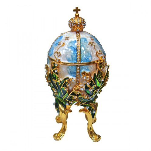 Розкішна шкатулка - яйце в стилі Фаберже 'Ландиші' виготовлено з металу, покрито холодною емаллю і інкрустовано стразами.