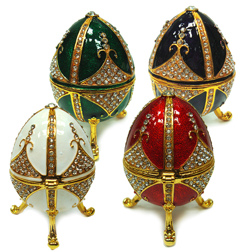 Розкішна шкатулка - яйце в стилі Фаберже виготовлено з металу, покрито холодною емаллю і інкрустовано стразами.