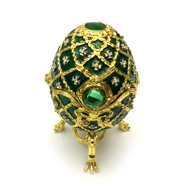 Розкішна шкатулка - яйце в стилі Фаберже виготовлено з металу, покрито холодною емаллю і інкрустовано стразами.