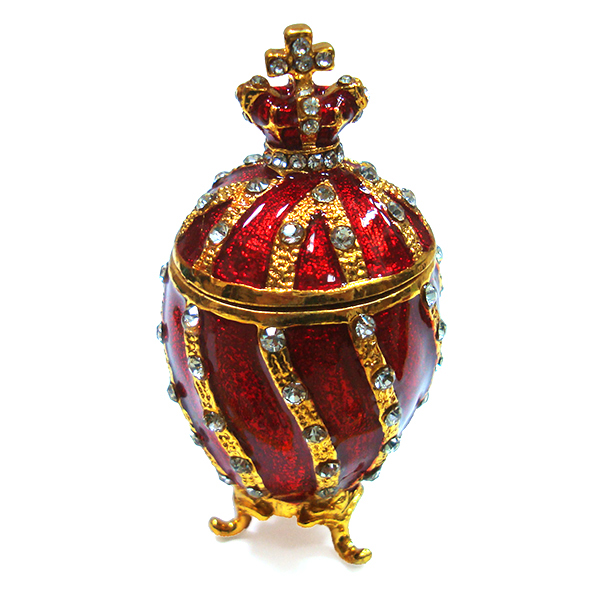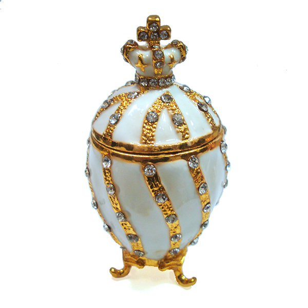 Розкішна шкатулка - яйце в стилі Фаберже виготовлено з латуні, покрито холодною емаллю і інкрустовано стразами.