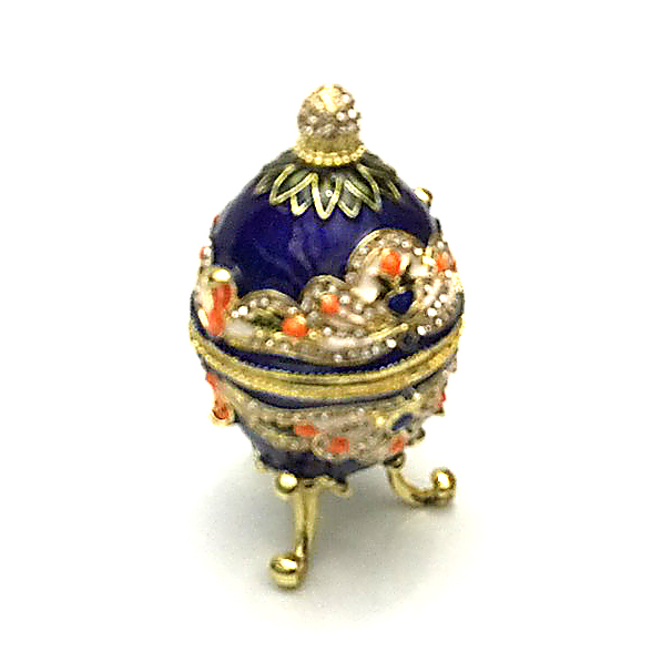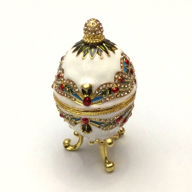 Розкішна шкатулка - яйце в стилі Фаберже виготовлено з металу, покрито холодною емаллю і інкрустовано стразами.