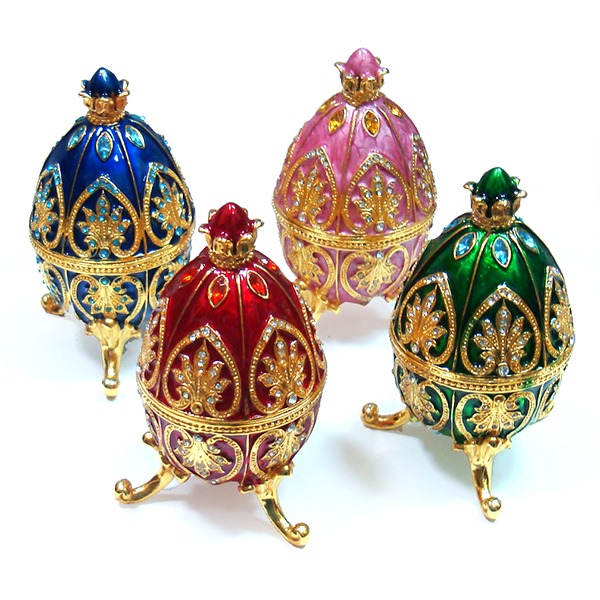 Розкішна шкатулка - яйце в стилі Фаберже виготовлено з металу, покрито холодною емаллю і інкрустовано стразами.