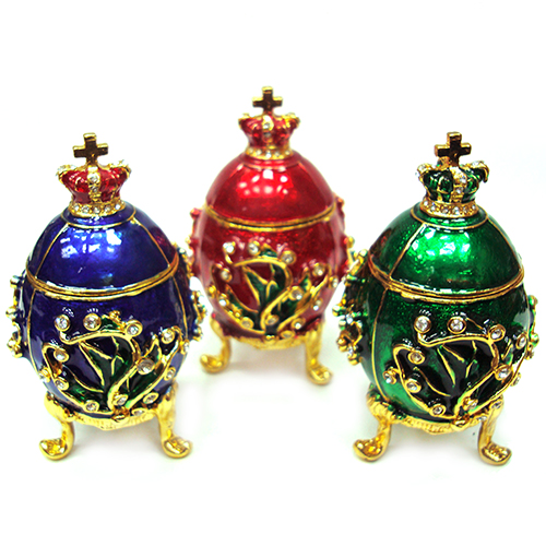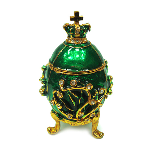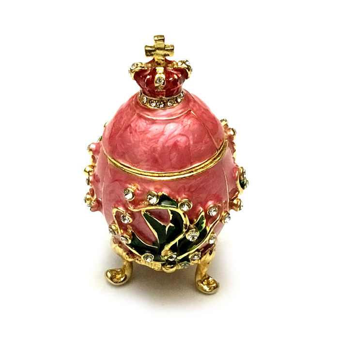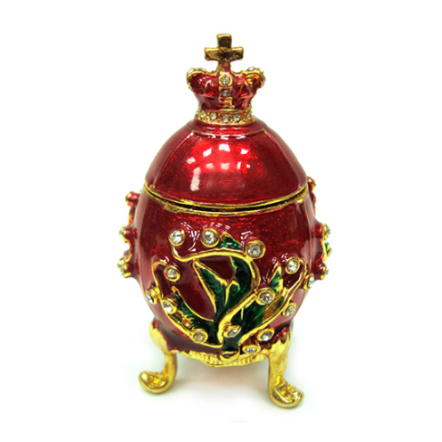 Розкішна шкатулка - яйце в стилі Фаберже виготовлено з металу, покрито холодною емаллю і інкрустовано стразами.