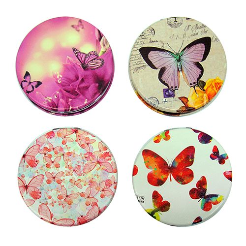 Дзеркало металеве з оздобленням зі штучної шкіри двостороннє кругле на магніті з різними зображеннями метеликів.
